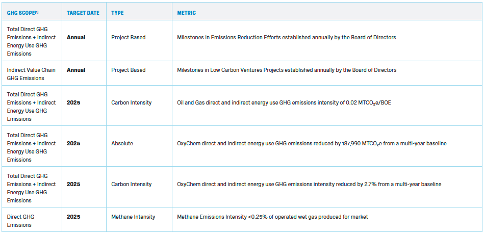 Oxy is a member of the Oil and Gas Climate Initiative (OGCI), a 12-member CEO-led initiative that focuses on leading the industry’s response to climate change and accelerating action towards a net-zero future. OGCI focuses on partnering, capacity building and innovations to target key technologies and areas that can have the greatest impact on emissions reductions. We are also an active participant in emissions reduction programs promoted through multiple associations, including the Methane Guiding Principles (MGP), the Oil and Gas Methane Partnership 2.0 (OGMP 2.0) and the World Bank's Zero Routine Flaring by 2030 Initiative. In addition, Climate Investment (CI) is a $1 billion-plus fund to which Oxy and other OGCI members contribute to invest in innovations that deliver capital-efficient decarbonization solutions and drive their adoption through CI’s partner networks to accelerate scaled impact. We are an original signatory to OGCI’s Aiming for Zero Methane Emissions Initiative, to the Oil and Gas Decarbonization Charter (OGDC) and committed funding to the World Bank’s GFMR Partnership at COP28. The GFMR Partnership is a multi-donor trust fund working to end routine gas flaring across the world and reduce methane emissions from the oil and gas sector to near zero by 2030.